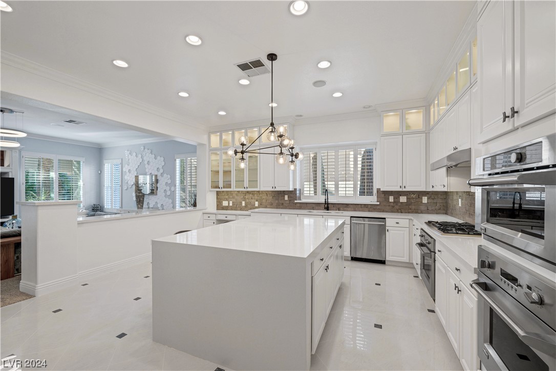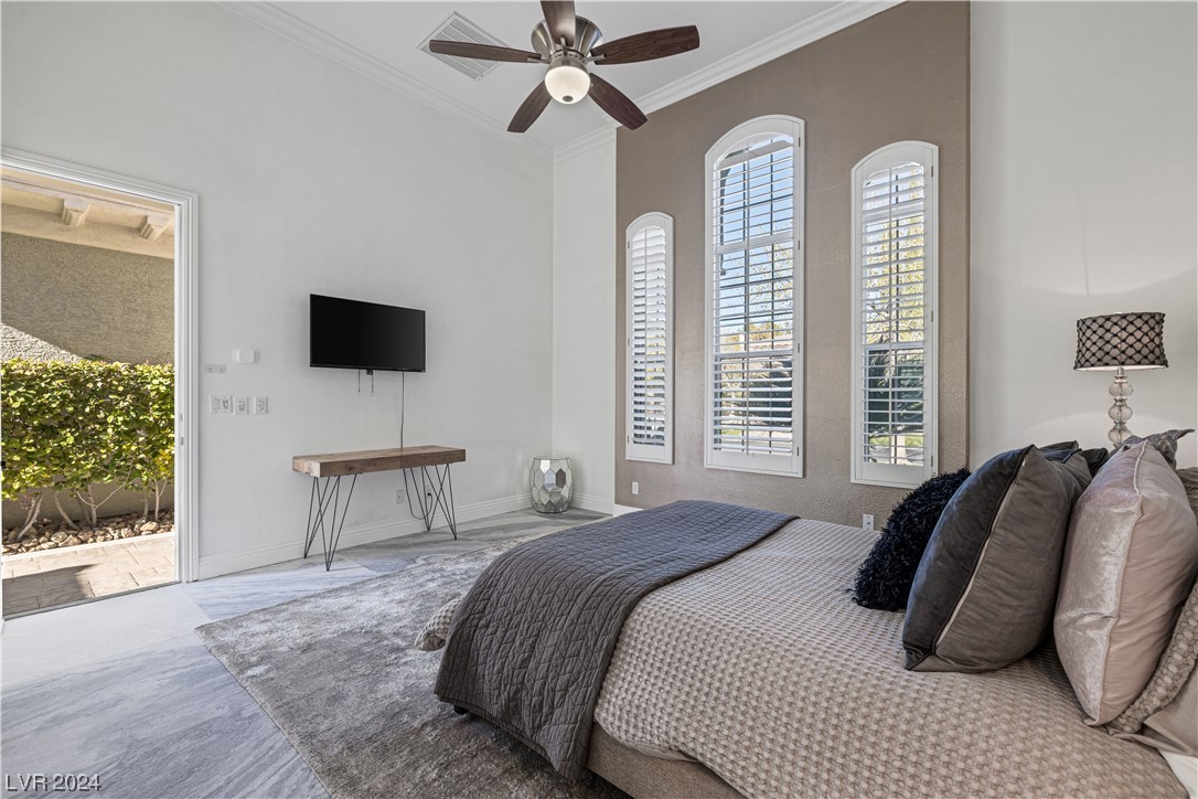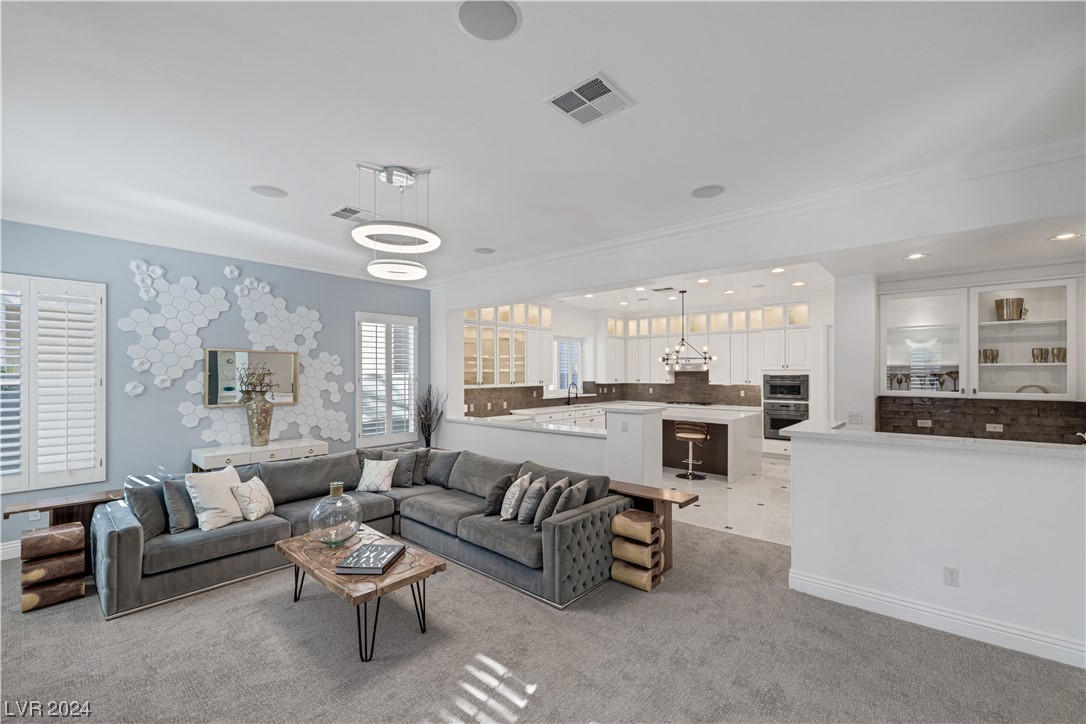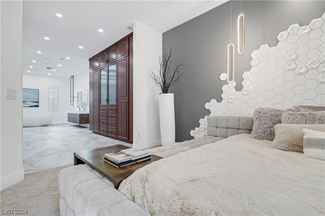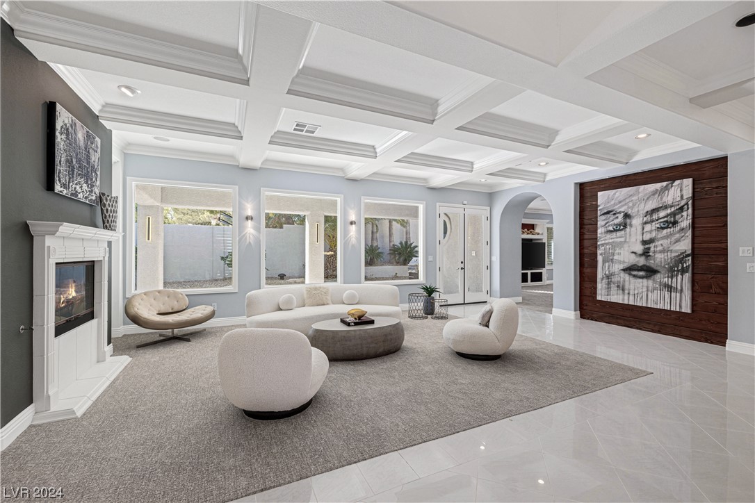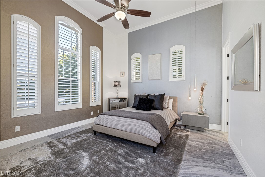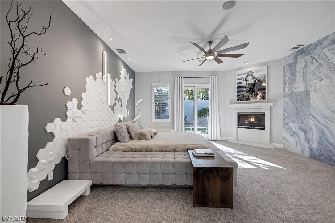 Step into guard-gated luxury at The Palisades in Summerlin! Come see this stunning single-story home, fully remodeled with with designer finishes, abundant natural light, an in-ceiling audio system throughout, four gas fireplaces, and a detached guest house tucked away in the large courtyard. The property is ideally situated next to the park on a corner lot with no neighbors on two sides. Indulge in the naturally shaded backyard, elegant gourmet kitchen, spacious living areas, and dreamy primary suite with spa-like marble-lined shower walls. Offering five bedrooms, 4.5 bathrooms, a 3-car garage, and an office spread over 4,079 sq ft, this home embodies a balance of comfort and style. Call William today to schedule a private tour of this breathtaking property.